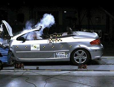 Купе-кабриолет прекрасно выдержал краш-тесты - даже со сложенной крышей силовая структура кузова отлично распределяет нагрузки и позволяет сохранить пространство внутри салона. Испытанный до того обычный хэтчбек Peugeot 307 показал даже худший рейтинг при фронтальном ударе (12 баллов), но лучше выступил при боковом краш-тесте (18 баллов).