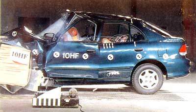 Поведение кузова корейской машины оставляет желать лучшего - нижняя петля водительской двери оторвалась от стойки, а верхняя висела на честном слове. Плюс к тому, сильно смещенная назад стойка лобового стекла разорвала металл порога. А подушка хоть и удержала голову водителя, но при срабатывании ударила его в грудь. Защита ног была признана слабой.
